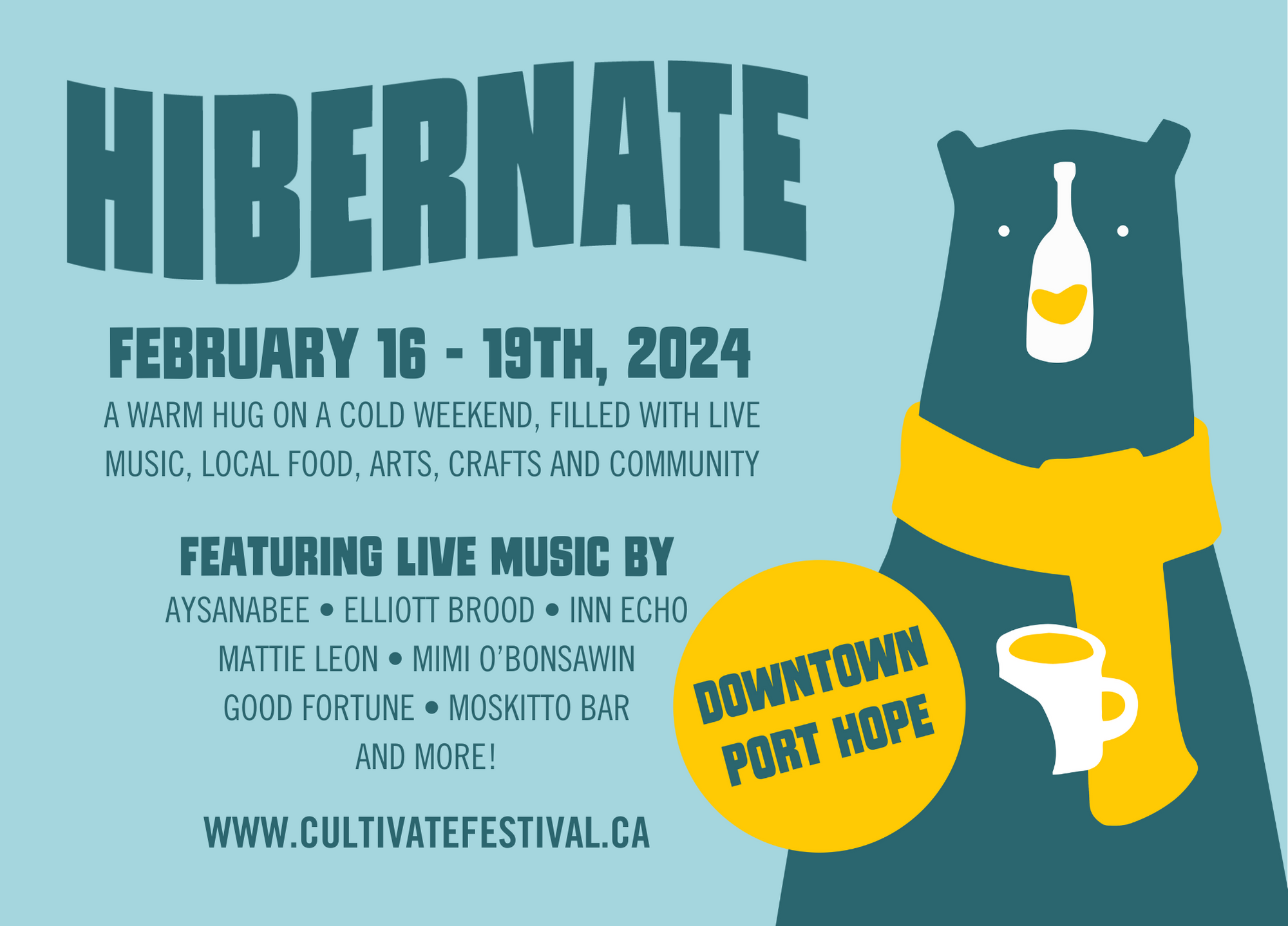Hibernate Festival takes place February 16th - 19th, 2024 all throughout downtown Port Hope. What is Hibernate? Think of it as a warm hug on a cold weekend, filled with live music, local food, arts, crafts and community. It is a winter themed, family day weekend festival in downtown, brought to you by the Cultivate Festival team. Festival programming will be spread out throughout downtown Port Hope and feature incredible live music, hands-on activities and tasty eats. There is a wide selection of free and ticketed events. Enjoy free live music in the afternoons and ticketed shows in the evenings. Weave your way through downtown Port Hope and join in on tons of FREE programming for the whole family scattered about some remarkable storefronts. Discover the full Hibernate weekend program and grab your Festival Passes today! Remember, kids 18 and under are free with a ticket holding adult.
