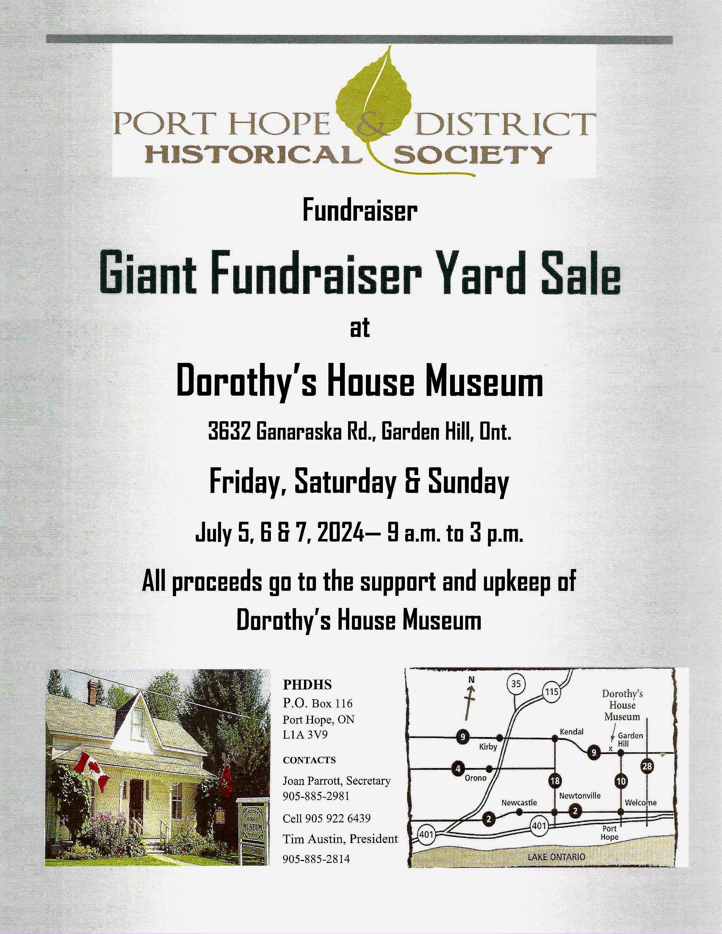 PHDHS ANNUAL FUNDRAISER YARD SALE AT DOROTHY'S HOUSE MUSEUM, 3632 GANARASKA ROAD, GARDEN HILL, ON. ALL PROCEEDS GO TO THE SUPPORT AND UPKEEP OF DOROTHY'S HOUSE MUSEUM. IF YOU HAVE ITEMS TO DONATE OR WISH TO HELP OUT DURING THE SALE, PLEASE CONTACT SECRETARY-TREASURER JOAN ASHBY PARROTT AT 905-885-2981 OR 905-922-6439. THERE WILL BE OTHER YARD SALES ALONG GANARASKA ROAD DURING THIS EVENT. THANK YOU FOR YOUR SUPPORT!