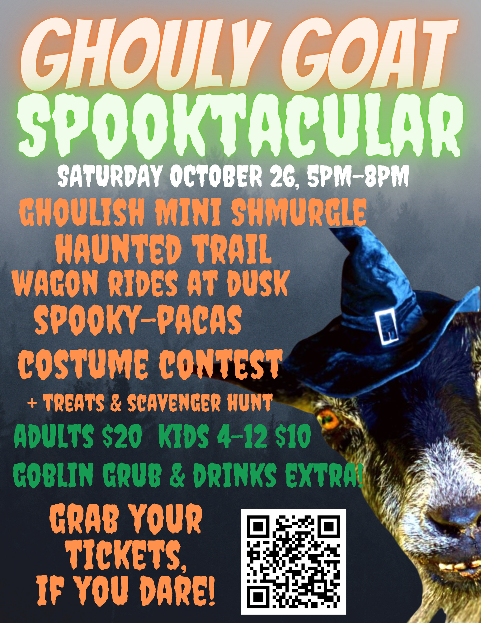 Join us for our Ghoully Goat Spooktacular. October 26th, 5pm-8pm. All tickets include entry to the Spooky Goat Mini-Shmurgle, Haunted Trail Walk, and Wagon Rides!