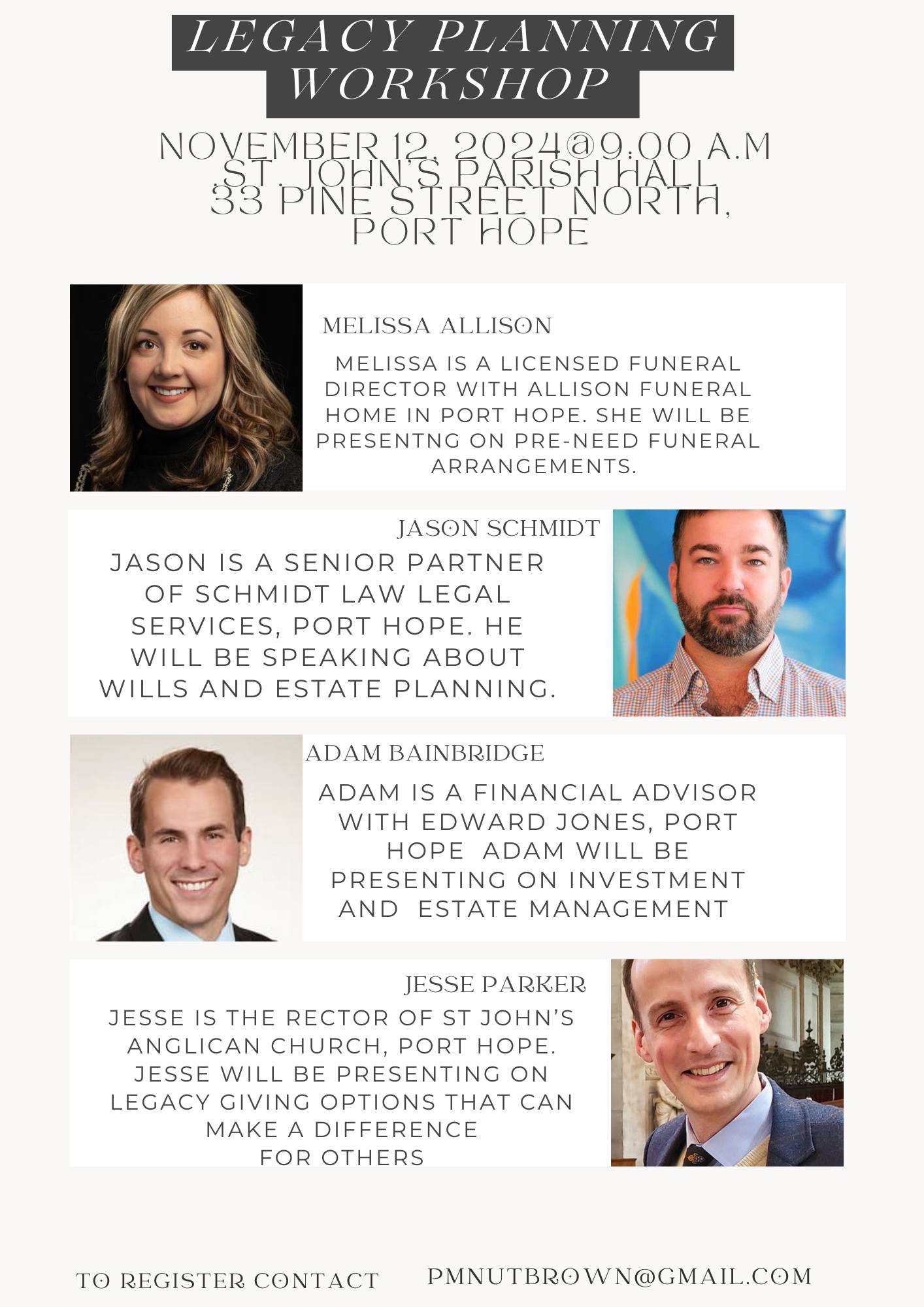 St John's Anglican Church (33 Pine Street North, Port Hope) is hosting a Legacy Planning Workshop from 9 to Noon on November 12 in the parish hall. If you have questions about such issues as preparing a will or power of attorney. making pre-need funeral arrangements, issues around financial planning and estate transfer, or charitable giving, 4 local experts (Melissa Allison of Allison Funeral Home, Jason Schmidt of Schmidt Law Legal Services, Adam Bainbridge of Edward Jones Financial and Canon Jesse Parker of St. John's) will be on hand to help. The event is open to everyone. There is no charge and snacks and tea and coffee will be served.