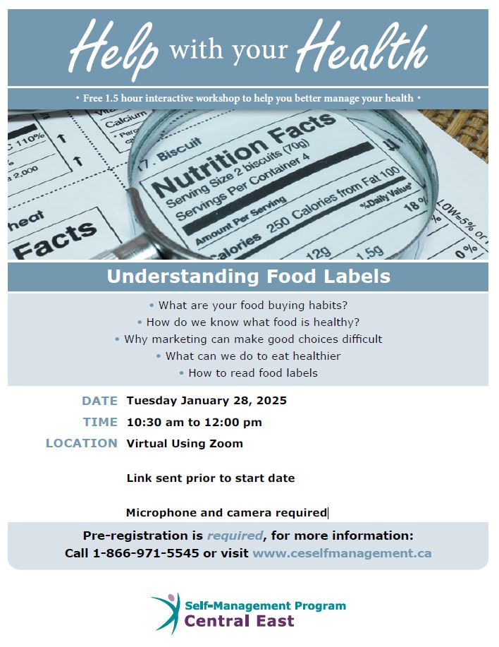 Understanding Food Labels is an interactive education workshop that teaches the important skill of reading labels on packaged foods so that you can make informed food choices that align with your health goals (less sodium, more fibre etc.). We will discuss our food buying habits, learn how marketing influences our choices and review the nutrition guidelines outlined by the Canada Food Guide.