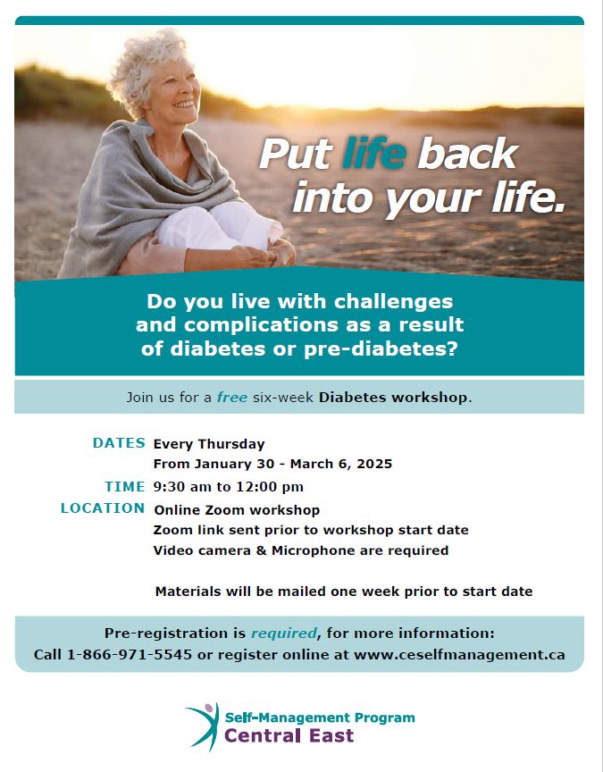 Join us for a FREE online 6-week workshop series where people learn skills and tools to better manage their diabetes and pre-diabetes. All participants will receive the "Living a Healthy Life with Chronic Conditions" resource book. Caregivers are welcome to register.