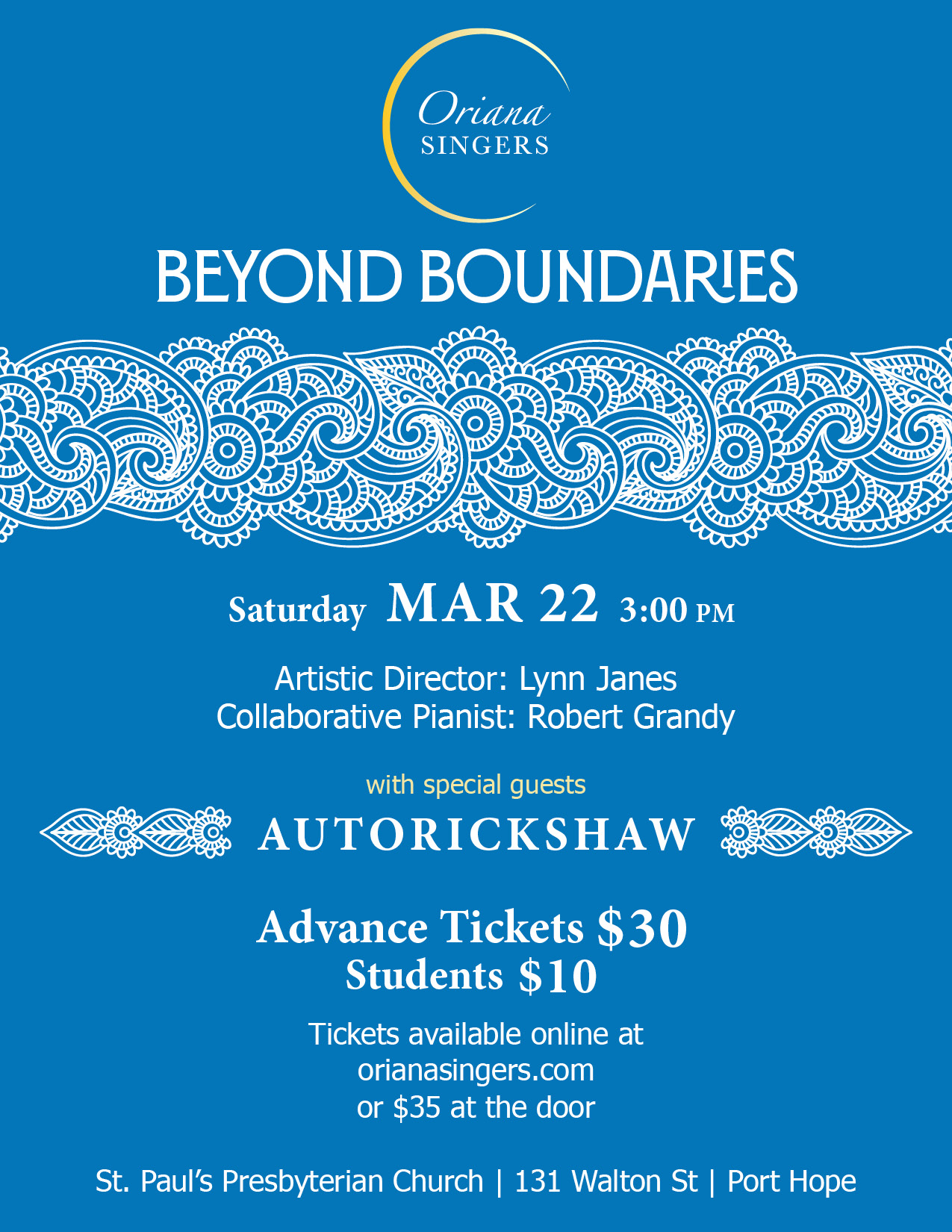 Join Oriana Singers for an amazing concert with special guests Autorickshaw Mar. 22 at St. Paul's Port Hope, exploring borders, boundaries and South Asian Music Traditions. Visit www.orianasingers.com for tickets.