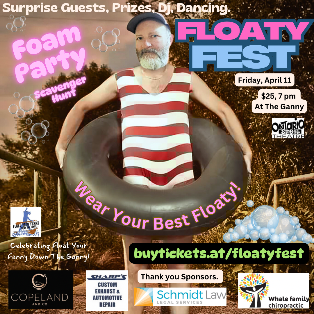 Introducing Floaty Fest! Wear your most silly, best, ludicrous Floaty to the Ganny on April 11. Best costume prizes. We will have special guests like a magician, juggler, balloon artist. Yes it's a children's party for Adults! AND THERE WILL BE FOAM!!! A foam party on the patio scavenger hunt!