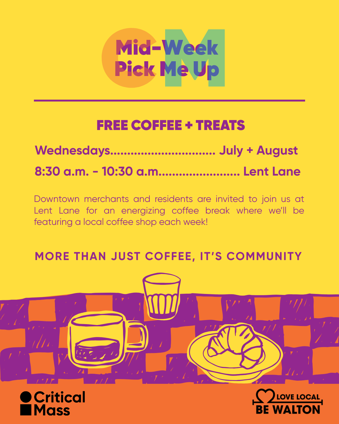 Downtown merchants and residents are once again invited to join us in Lent Lane for an energizing coffee break where we will be featuring a local coffee shop each week.