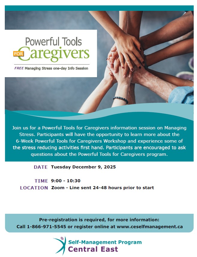 In this FREE online one time session participants will have the opportunity to learn more about the 6-week Powerful Tools for Caregiver workshop series and experience some stress reducing activities first hand.
