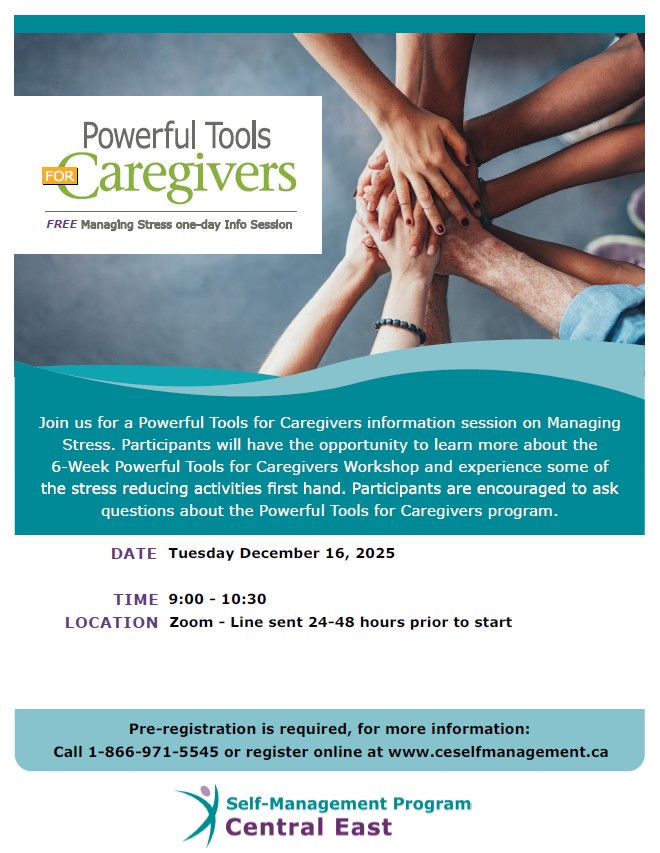 In this FREE online one time session participants will have the opportunity to learn more about the 6-week Powerful Tools for Caregiver workshop series and experience some stress reducing activities first hand.