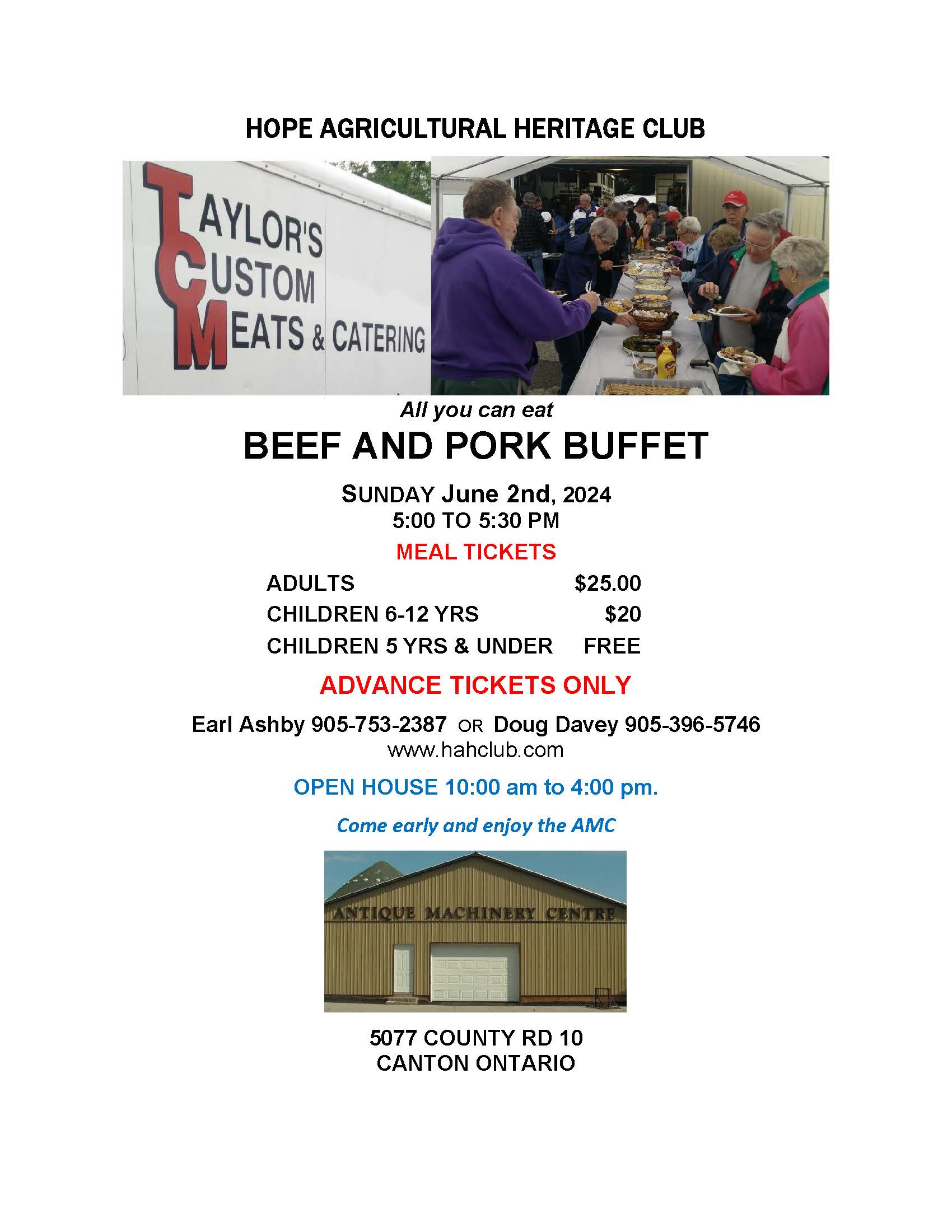 HOPE AGRICULTURAL HERITAGE CLUB All you can eatBEEF AND PORK BUFFET SUNDAY June 2nd, 20245:00 TO 5:30 PMMEAL TICKETSADULTS $25.00CHILDREN 6-12 YRS $20CHILDREN 5 YRS & UNDER FREEADVANCE TICKETS ONLYOPEN HOUSE 10:00 am to 4:00 pm.Come early and enjoy the ANTIQUE MACHINERY CENTRE