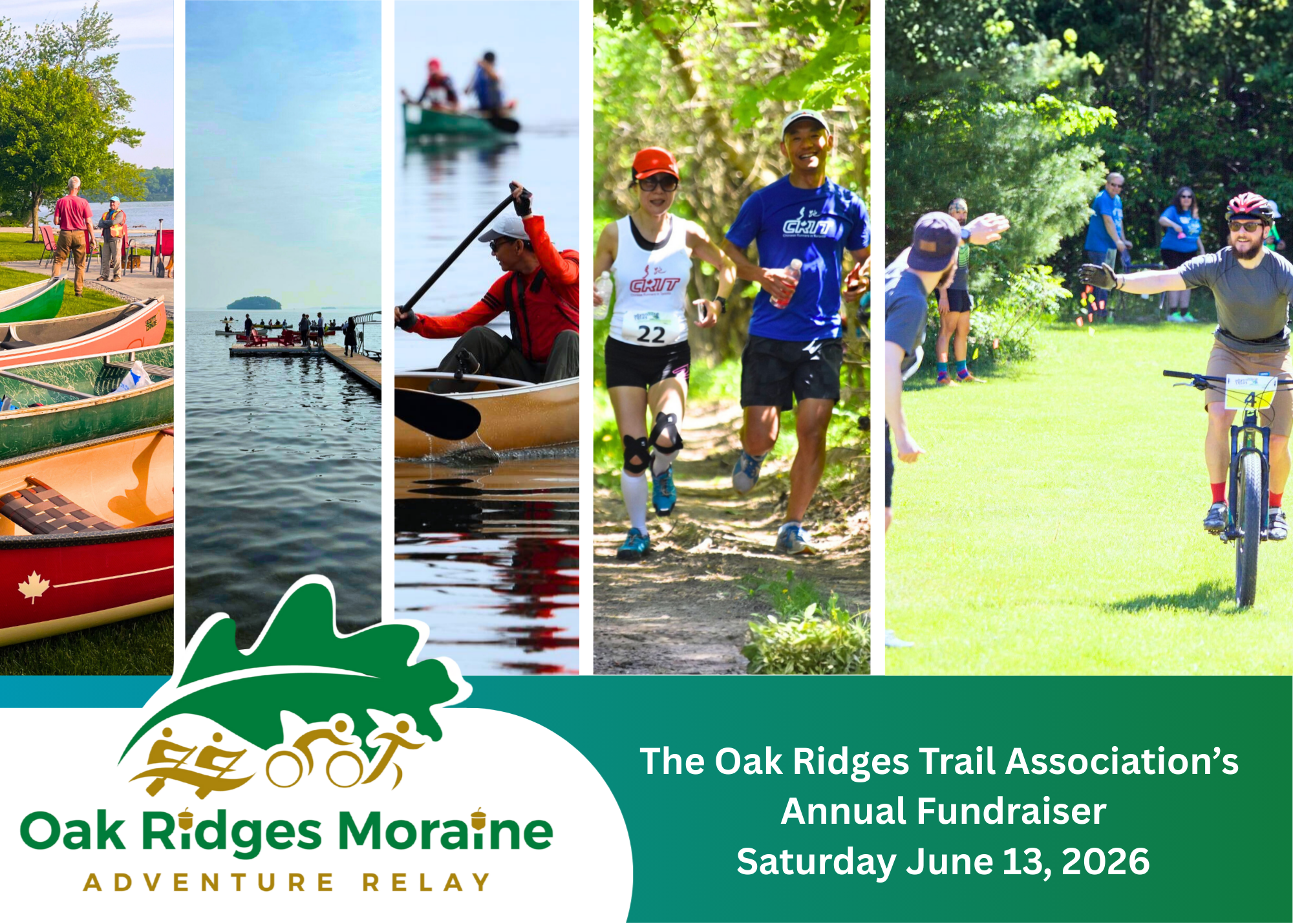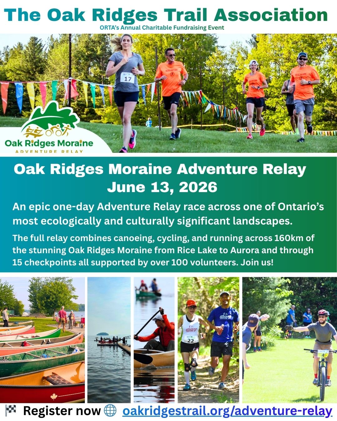 The Oak Ridges Moraine Adventure Relay is the charitable fundraising event for the Oak Ridges Trail Association (ORTA). The race is an epic one-day adventure relay that will take place on Saturday, June 13 2026, drawing athletes and outdoor enthusiasts from across Ontario. Spanning approximately 160km from Rice Lake to Aurora (with a shorter half-relay on the eastern course), the relay combines canoeing, mountain biking, road cycling, and trail running across the stunning Oak Ridges Moraine.